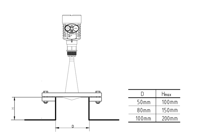 注:使用雷達物位計時,務(wù)必保證@高料位不能進入測量盲區(qū)(圖中D所示區(qū)域)。